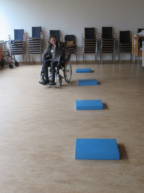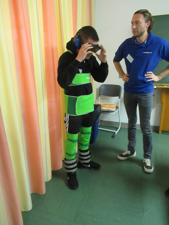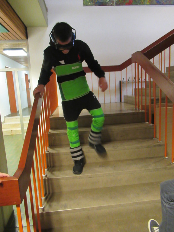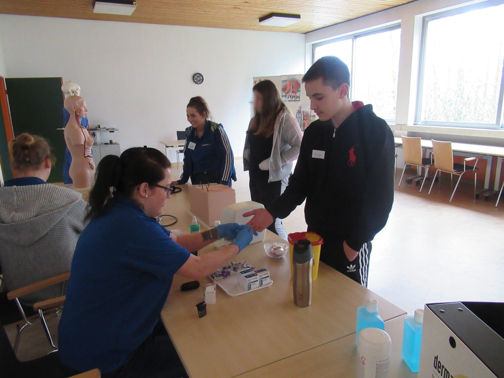 Neben vielen theoretischen Informationen zur Aus- und Weiterbildung, die die Schüler des laufenden Ausbildungsjahrgangs an unsere Schüler weitergaben, durften die Achtklässler aber auch ganz viel praktisch erproben und so z. B. am eigenen Leib erfahren, wie es sich anfühlt, wenn man nicht mehr richtig sieht, oder nur noch beschwerlich laufen kann etc. An verschiedenen Stationen konnten die Schüler ihren eigenen Blutzuckerspiegel messen, mit dem Rollstuhl einen Parcours bewältigen, mit Senioren aus dem angrenzenden Wohnheim Mensch-ärgere-dich-nicht spielen, Geschichten aus alten Zeiten lauschen und vieles mehr.