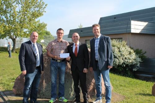 Scheckübergabe der Sparkasse Miltenberg Obernburg durch Herrn G. Carrierie an Herrn Rüdiger Huth, 1. Vors. des Elternbeirats der Konrad-Wiegand Grund- und Mittelschule.