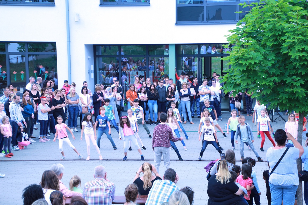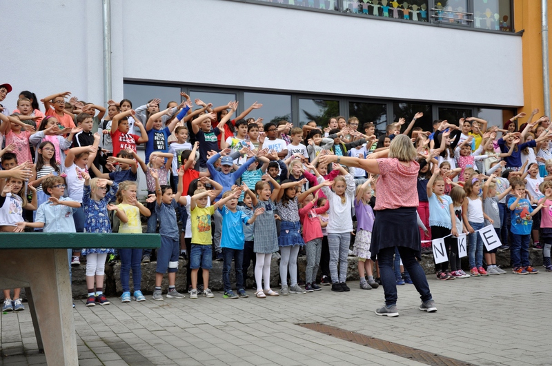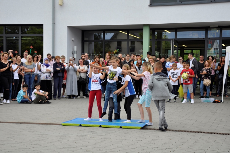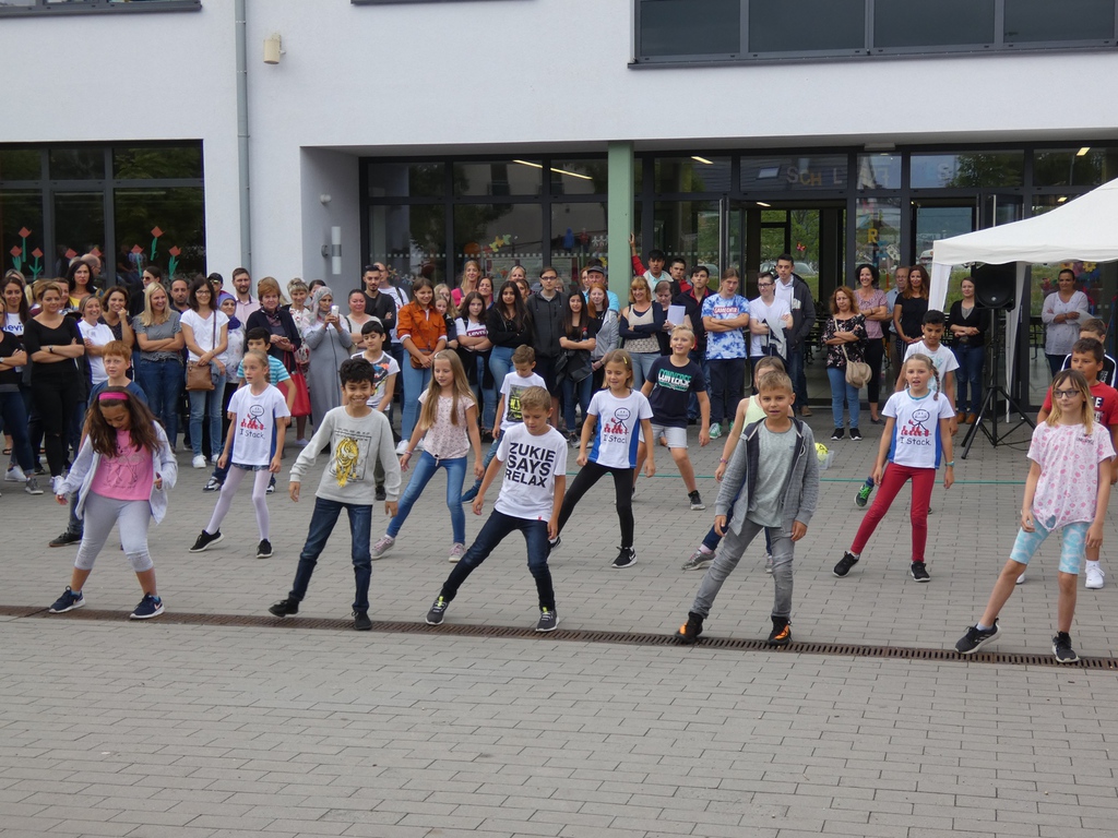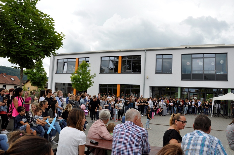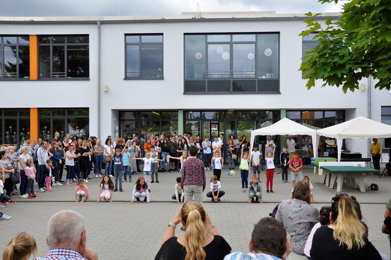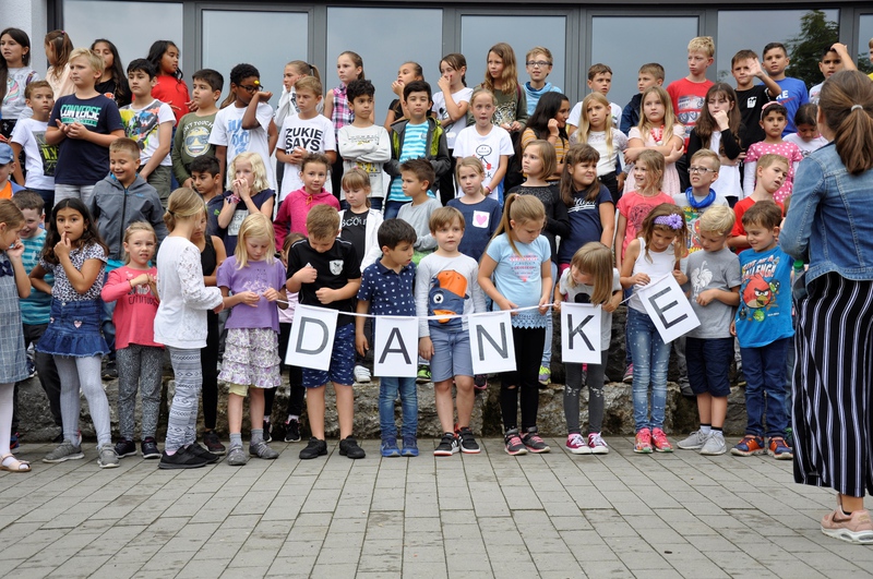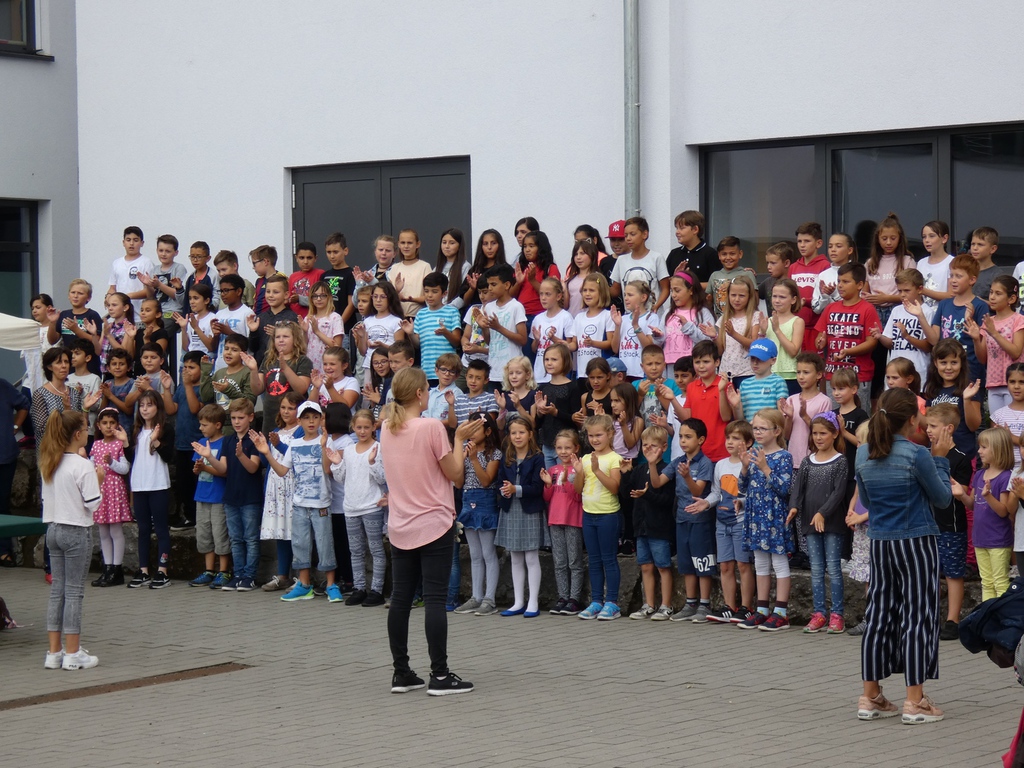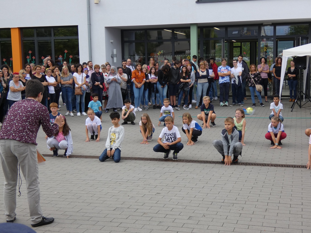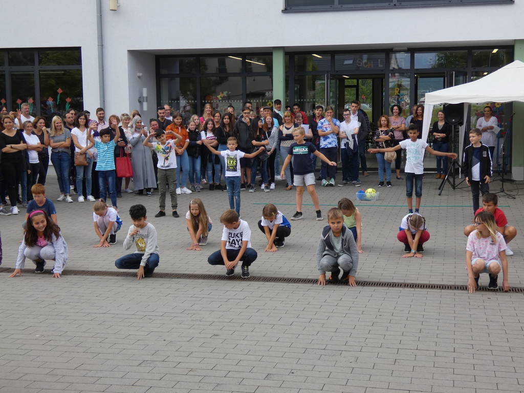 Nach Begrüßungsworten durch den Elternbeirat und durch Bürgermeister Ralf Reichwein stellten einzelne Schüler neu gekaufte Pausenspielgeräte vor. Diese konnten nach dem Lauftag, bei dem die Schüler über 3000 Runden erlaufen hatten und ortsansässige Firmen sowie die Familien und Freunde der Schüler als Sponsoren tätig waren, angeschafft werden. Eine perfekt einstudierte Tanzeinlage der Klasse 3a zu fetzigen Rhythmen begeisterte das Publikum und rundete die Eröffnung ab.