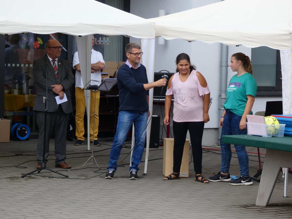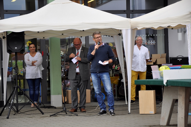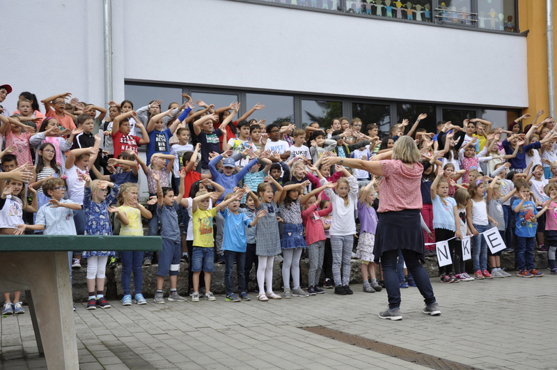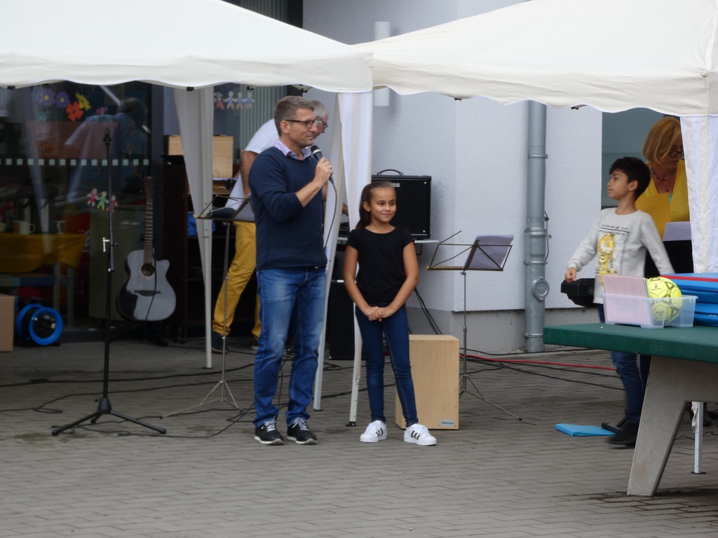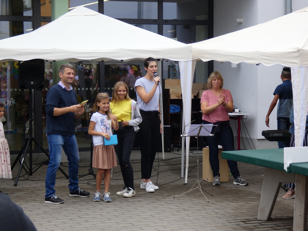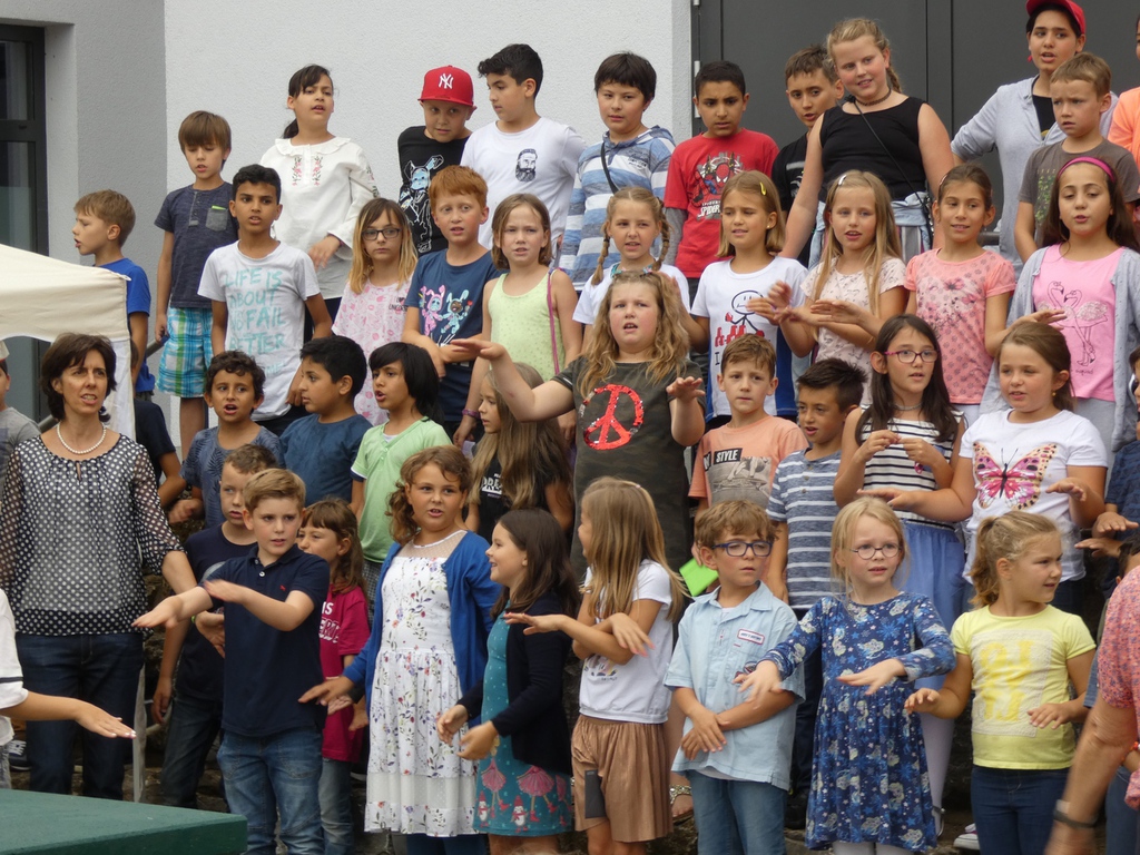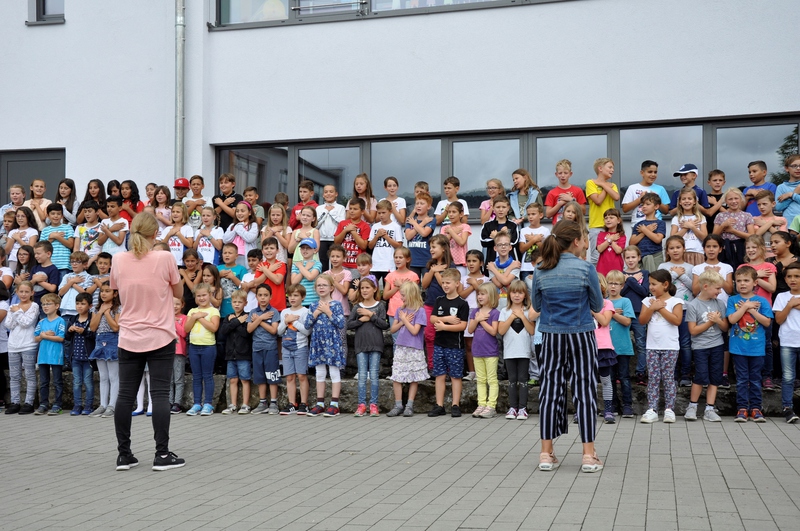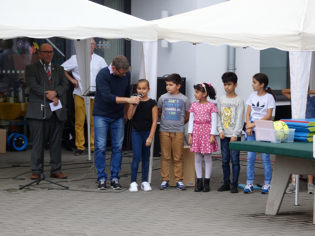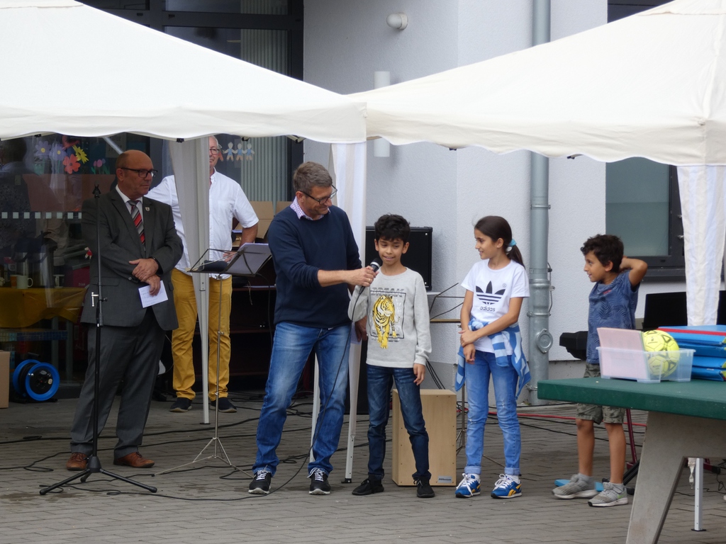 Nach Begrüßungsworten durch den Elternbeirat und durch Bürgermeister Ralf Reichwein stellten einzelne Schüler neu gekaufte Pausenspielgeräte vor. Diese konnten nach dem Lauftag, bei dem die Schüler über 3000 Runden erlaufen hatten und ortsansässige Firmen sowie die Familien und Freunde der Schüler als Sponsoren tätig waren, angeschafft werden. Eine perfekt einstudierte Tanzeinlage der Klasse 3a zu fetzigen Rhythmen begeisterte das Publikum und rundete die Eröffnung ab.