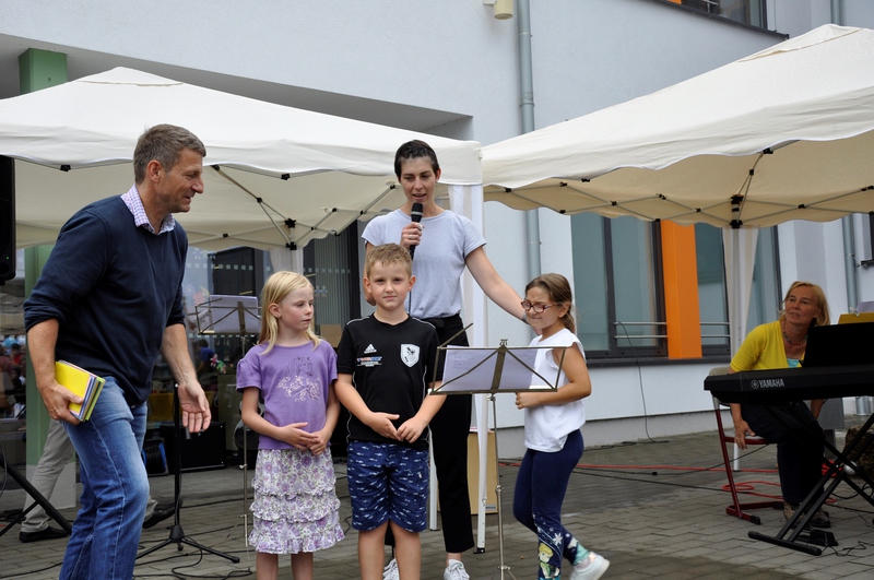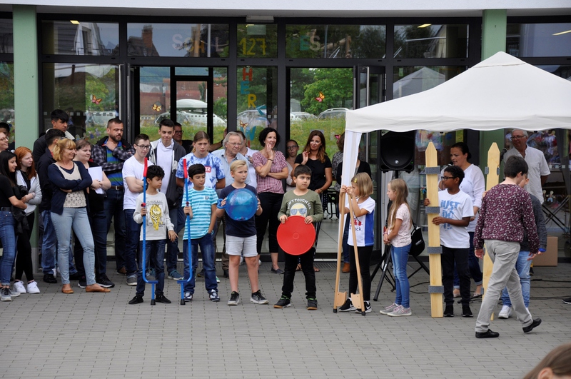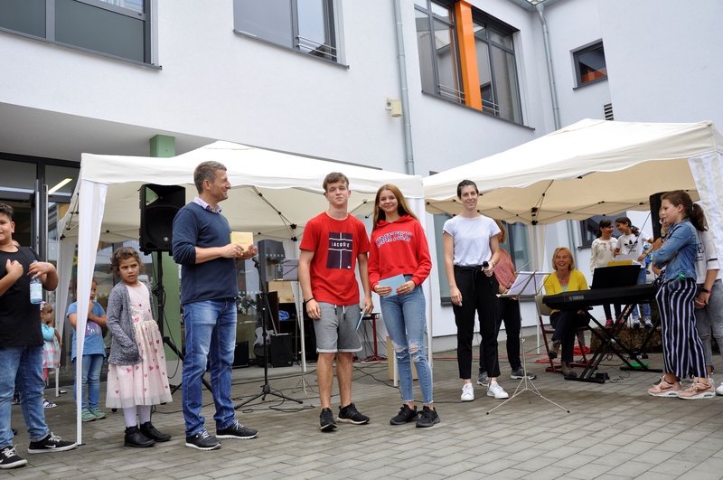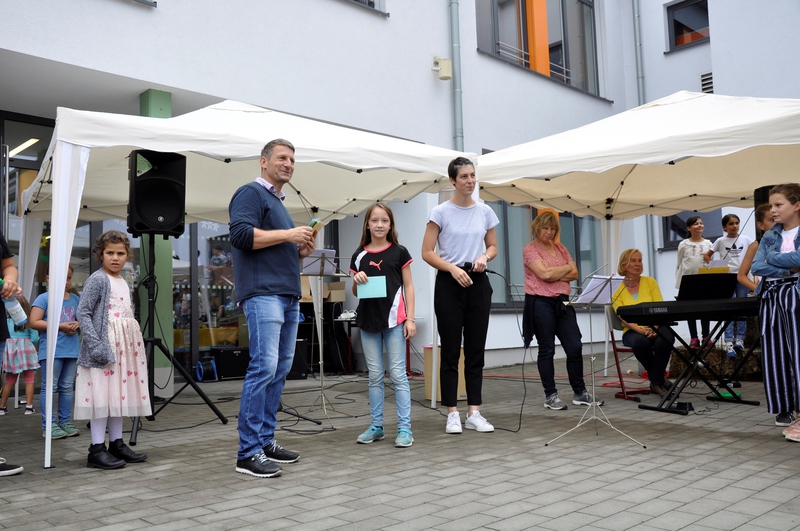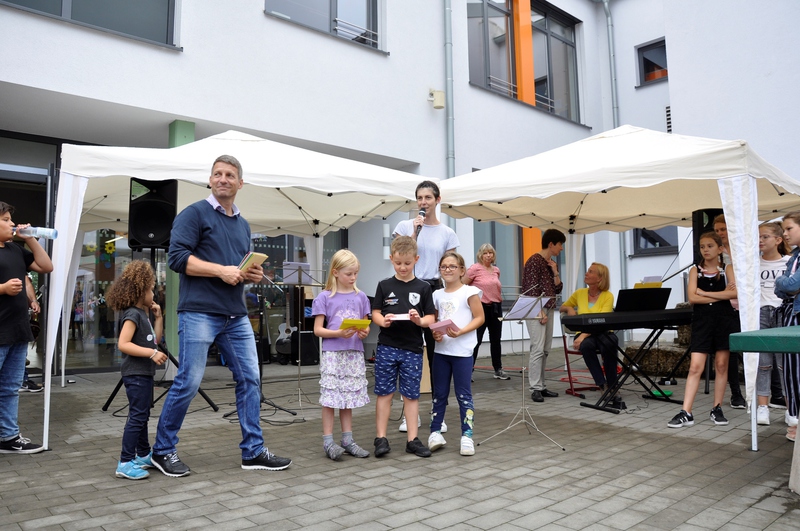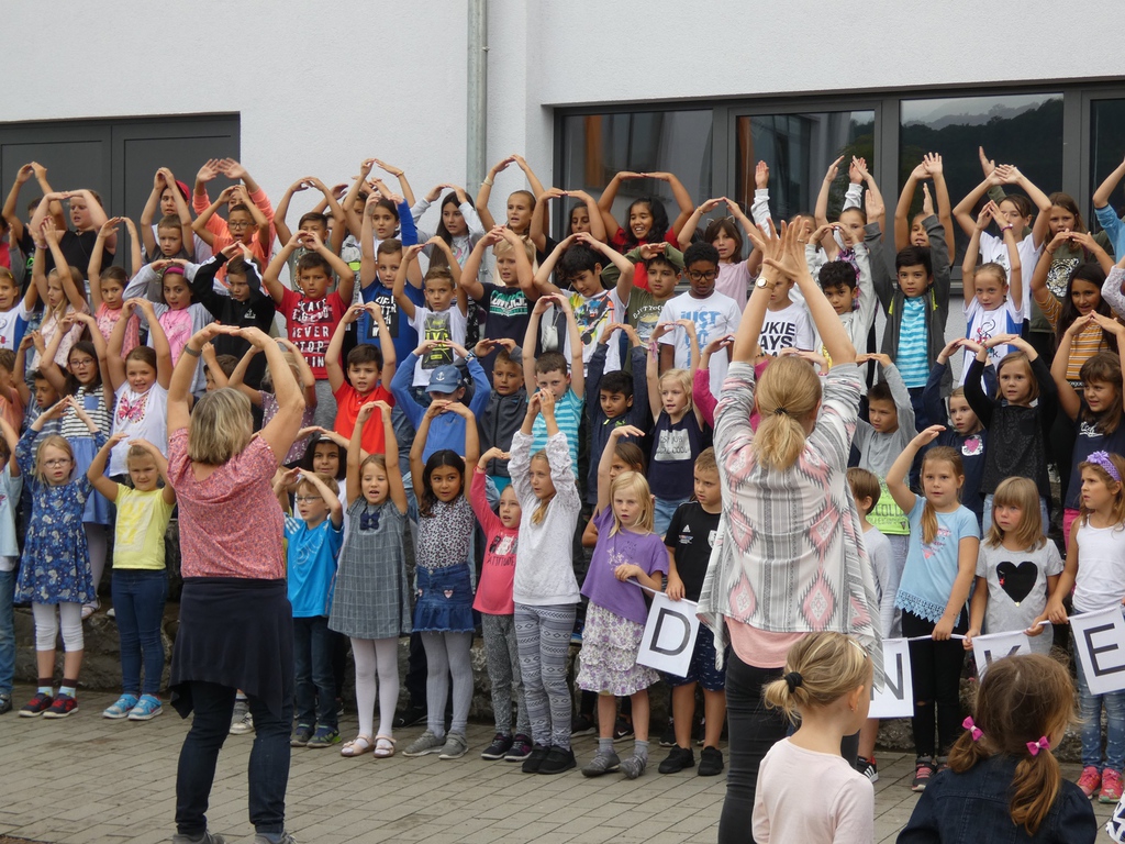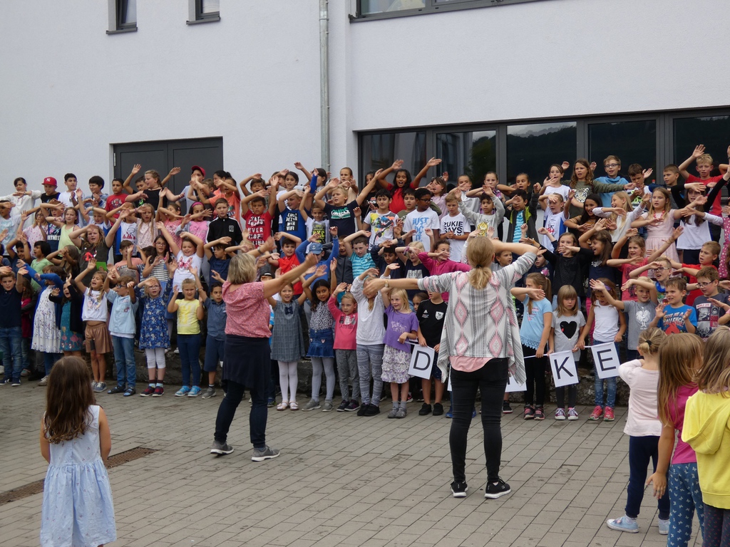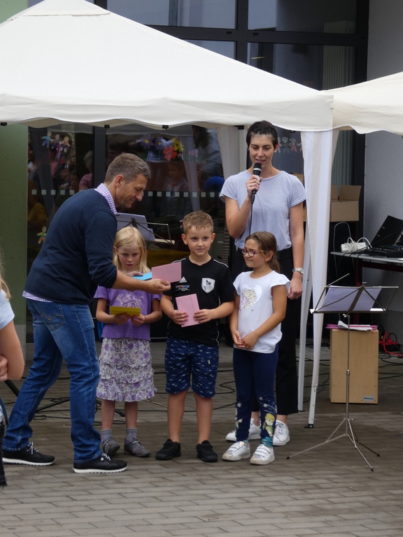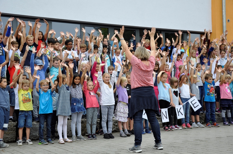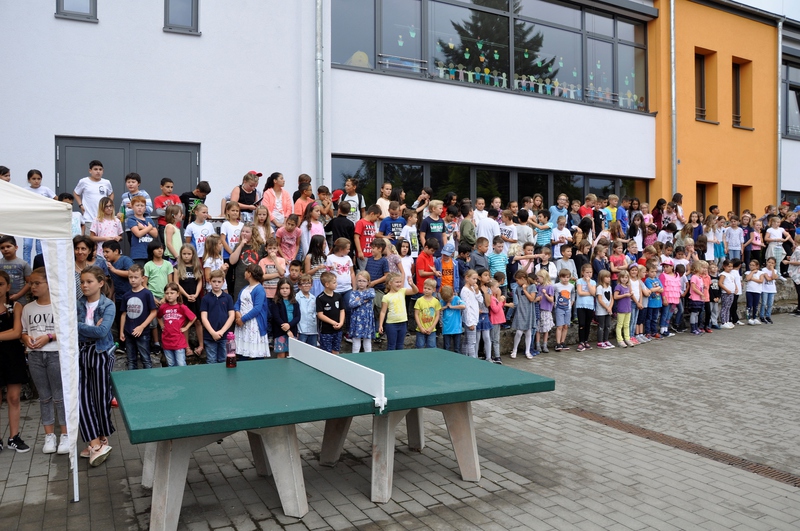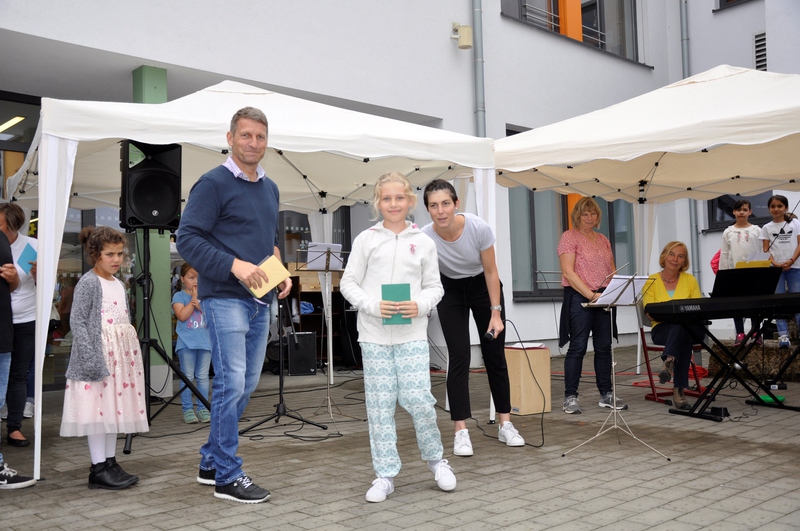 Nach Begrüßungsworten durch den Elternbeirat und durch Bürgermeister Ralf Reichwein stellten einzelne Schüler neu gekaufte Pausenspielgeräte vor. Diese konnten nach dem Lauftag, bei dem die Schüler über 3000 Runden erlaufen hatten und ortsansässige Firmen sowie die Familien und Freunde der Schüler als Sponsoren tätig waren, angeschafft werden. Eine perfekt einstudierte Tanzeinlage der Klasse 3a zu fetzigen Rhythmen begeisterte das Publikum und rundete die Eröffnung ab.