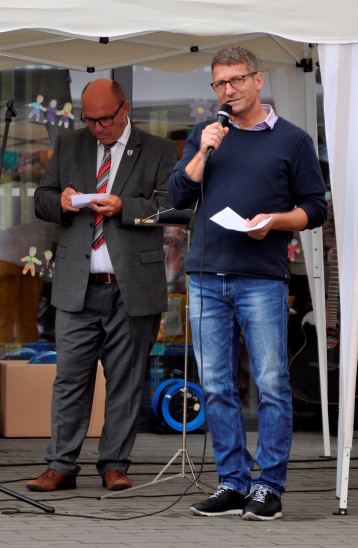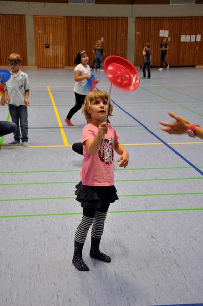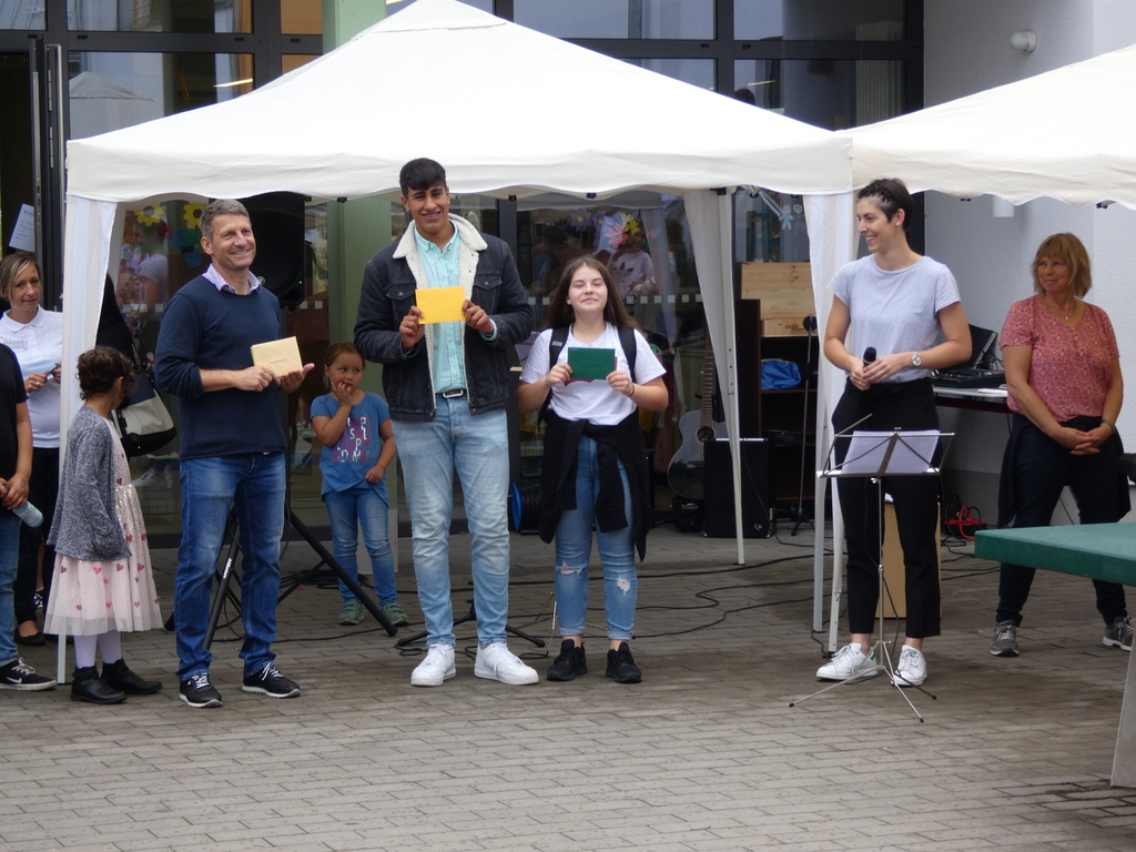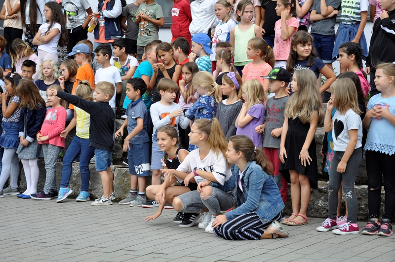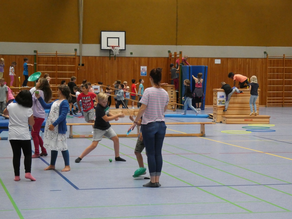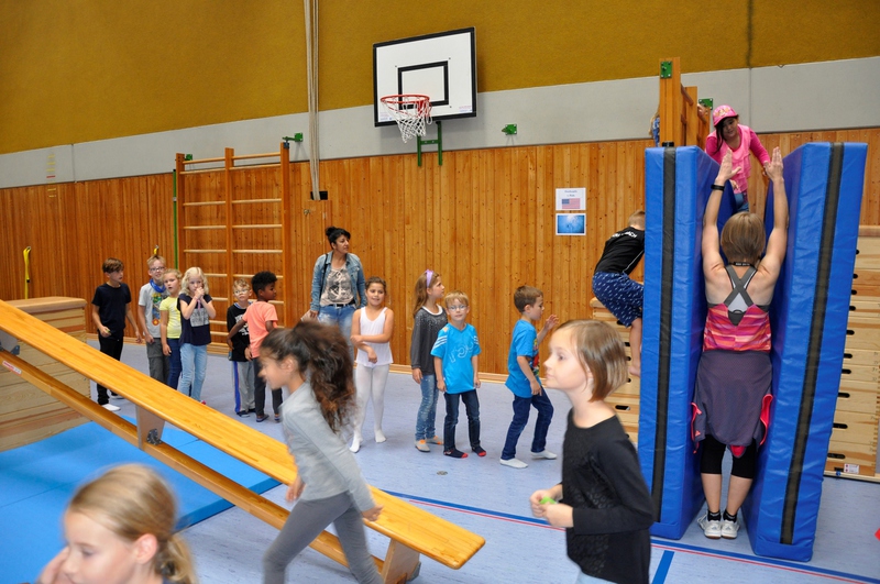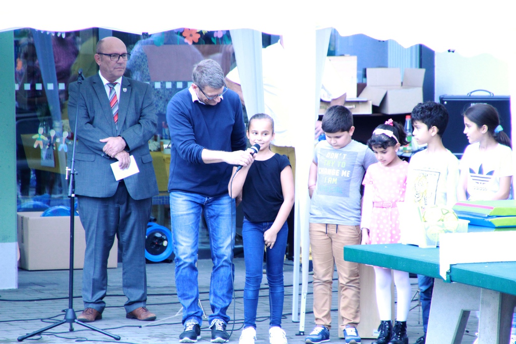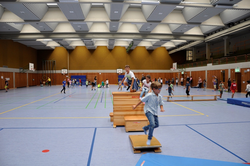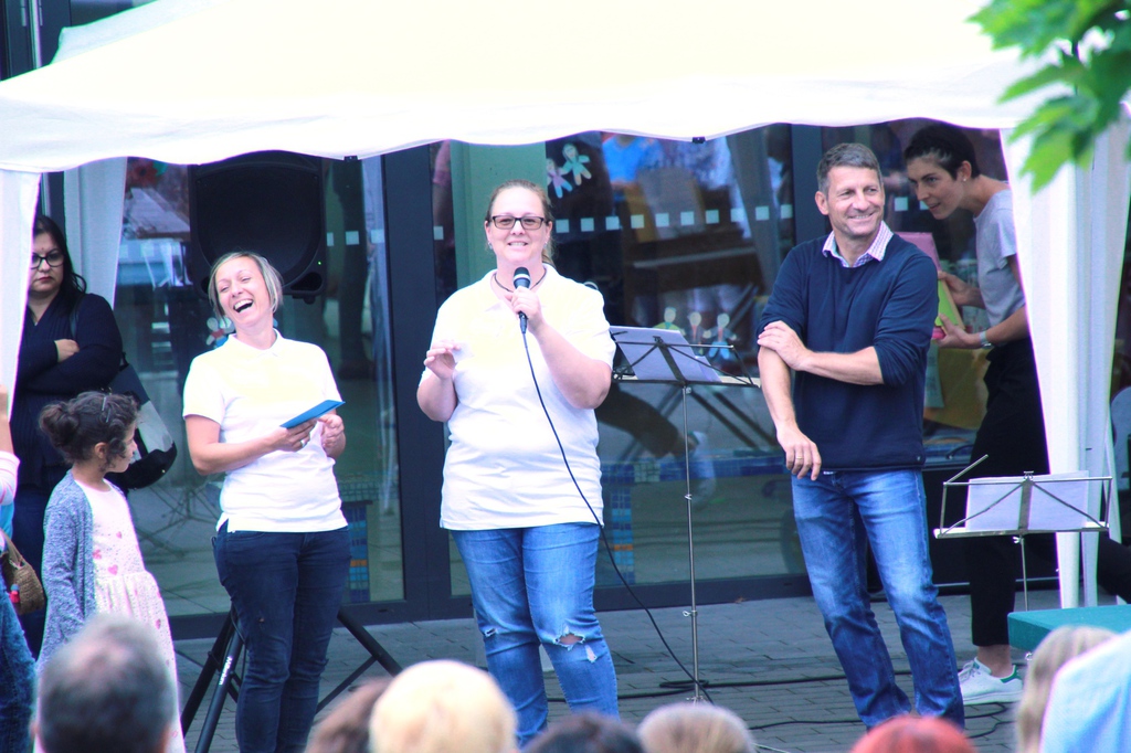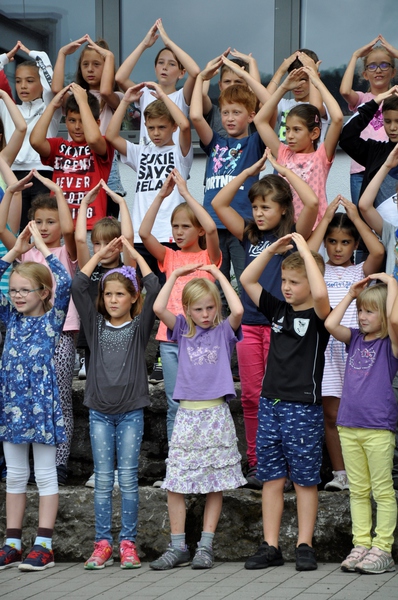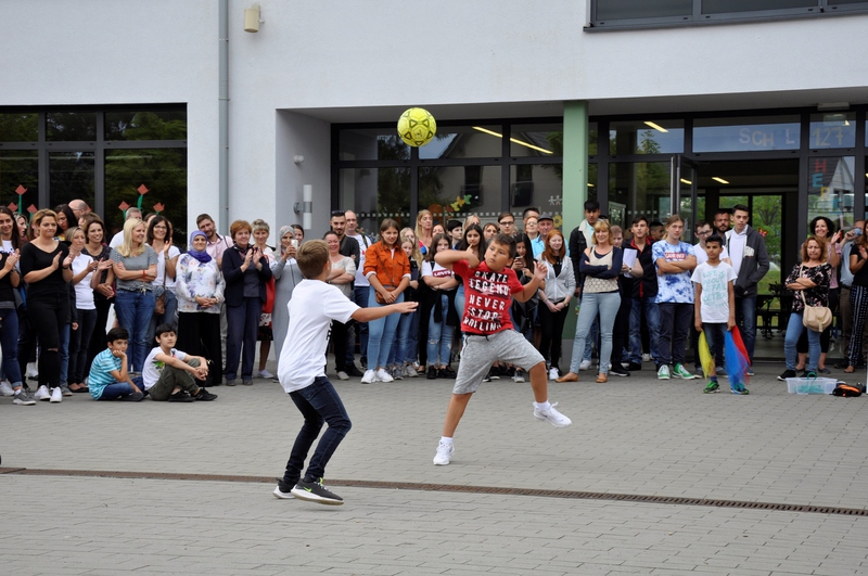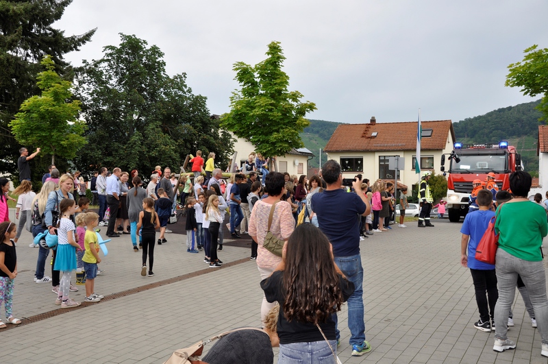 Nach Begrüßungsworten durch den Elternbeirat und durch Bürgermeister Ralf Reichwein stellten einzelne Schüler neu gekaufte Pausenspielgeräte vor. Diese konnten nach dem Lauftag, bei dem die Schüler über 3000 Runden erlaufen hatten und ortsansässige Firmen sowie die Familien und Freunde der Schüler als Sponsoren tätig waren, angeschafft werden. Eine perfekt einstudierte Tanzeinlage der Klasse 3a zu fetzigen Rhythmen begeisterte das Publikum und rundete die Eröffnung ab.