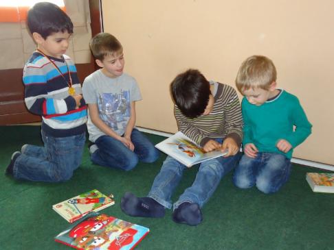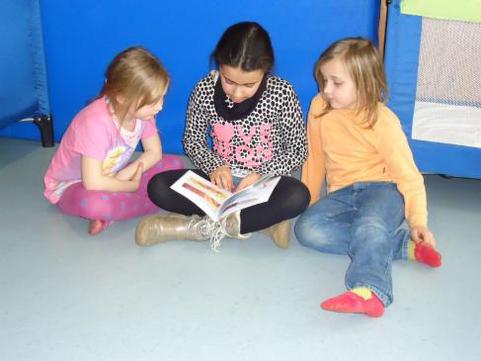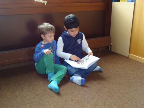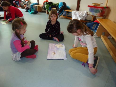 Nun trafen wir uns am Donnerstag ganz aufgeregt in der Schule und stellten uns noch kurz gegenseitig unsere mitgebrachten Kinderbücher vor. Im Kindergarten angekommen, teilten wir kleine Gruppen ein und suchten uns ein gemütliches Plätzchen auf dem Boden. Begeistert lasen wir nun unsere Geschichten vor, sprachen mit den Kindern über die Bilder und waren überrascht, was sich die Kleinen schon alles merken konnten.