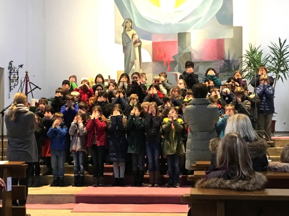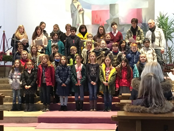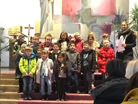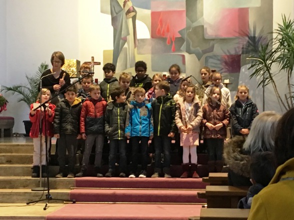 Auch der für diesen Anlass neu gebildete Lehrerchor beteiligte sich mit drei Musikstücken. Eines davon mit dem Titel „Ich will dich anbeten“ wurde gemeinsam mit den Klassen 3a und 4a des Schulhauses Trennfurt erstmals an diesem Vormittag der Öffentlichkeit präsentiert. Die zarten Kinderstimmen, vermischt mit dem mehrstimmigen Gesang der Lehrerinnen und Lehrer, begleitet vom gefühlvollen Klavierspiel der Klassenlehrkraft Frau Treser-Olt, verfehlten ihre Wirkung bei den Zuhörern nicht.